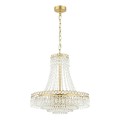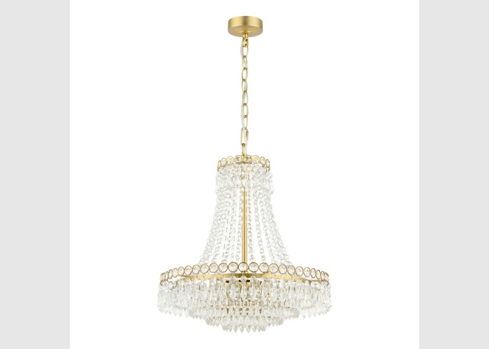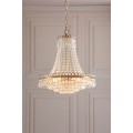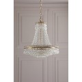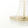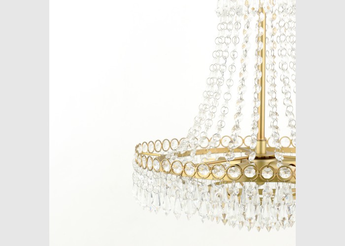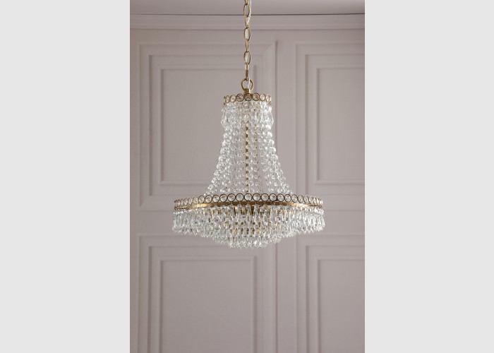 With a cascade of crystal beads flowing downwards and outwards from a narrow circlet to a wider one, from which are suspended cut droplets in ever-decreasing circles, this French-influenced ceiling light is made of clear, cut crystal, hand polished to give a smooth surface, on a metal frame finished with matt antique brass.