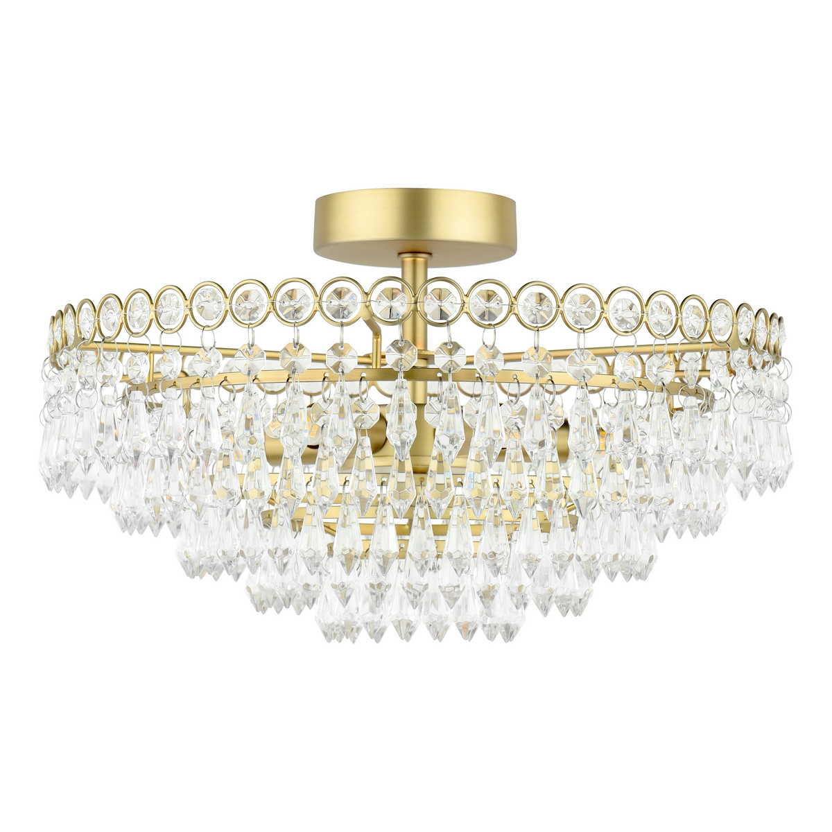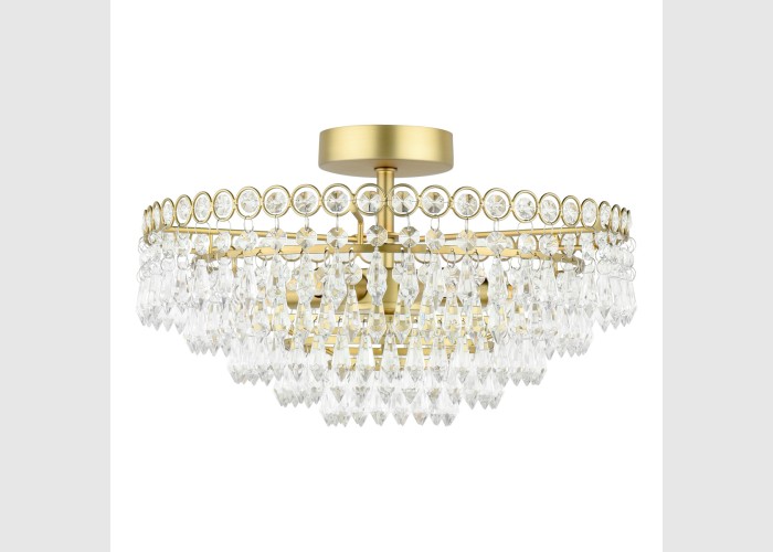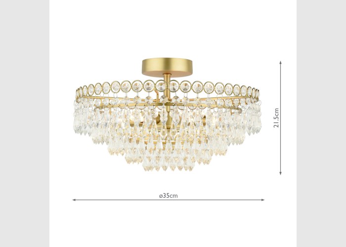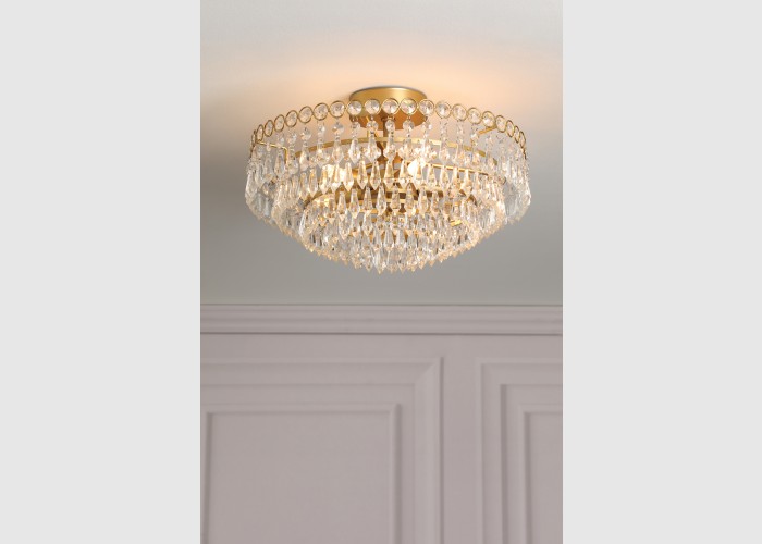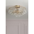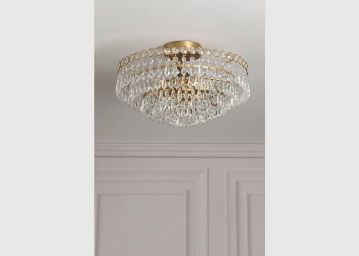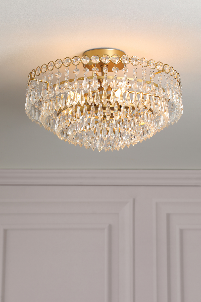 An effortlessly sophisticated lighting option, the Laura Ashley 5 Light Enid Semi-Flush ceiling light boasts a cascade of delicate crystal beads, this opulent French-influenced ceiling light will always be in style. Clear, cut crystals, hand polished to give a smooth surface, are suspended from a metal frame finished with matt antique brass. A semi-flush sits close to the ceiling on a short stem, with no visible cable.