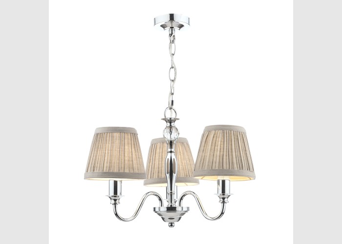 Three arms in a bright polished chrome finish flow out from the spindle-shaped body incorporating a pretty faceted glass ball. This delightful ceiling light comes complete with light grey pleated cotton shades.