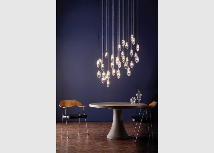 The Crystal 12 Light Pendant features a cluster of faceted rock crystals which cascade from a polished chrome ceiling plate.