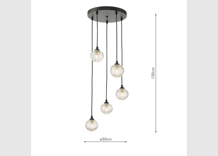 The Federico 5 Light Spiral Cluster Pendant is a minimal design in matt black with 5 spiralling clear ribbed glass shades. We find it’s minimalism so versatile and refreshing, it’s just at home as a stairwell light as it is lighting a dining table or over a bed. The black fabric cable can be adjusted on installation but if you want to go very short you will need the help of an electrician.