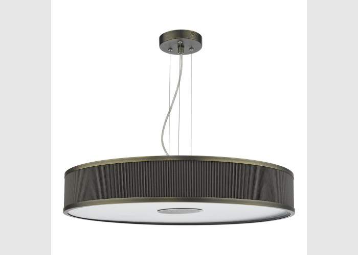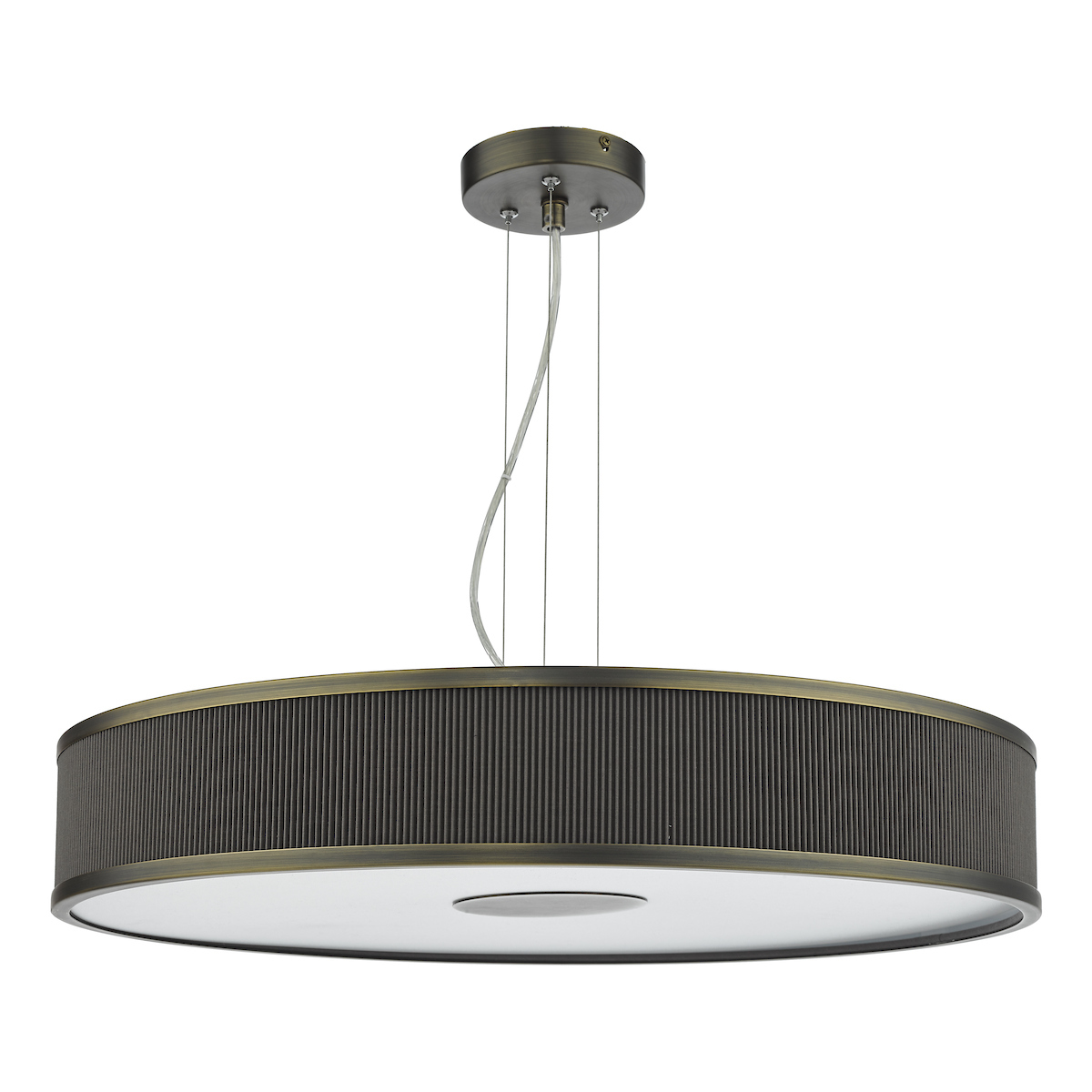 The Alvaro 6 Light Pendant in mushroom (warm grey) and Antique brass with its slender profile provides a contemporary silhouette; tightly pleated cotton fabric add texture adds interest to this minimal form.
