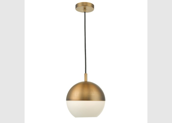 The ANDRE is a contemporary pendant with an aged brass canopy and opal white glass. Suspended by a single braided black cable.