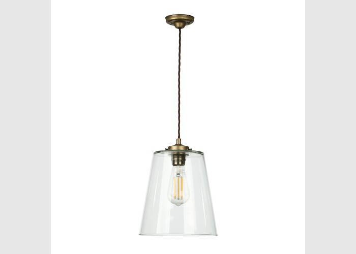 The David Hunt Ibsley Single Pendant in aged brass and glass with matching brown cotton braided cable. A trio over an kitchen island is an ideal place to utilise the simplicity of Ibsley's design appeal.