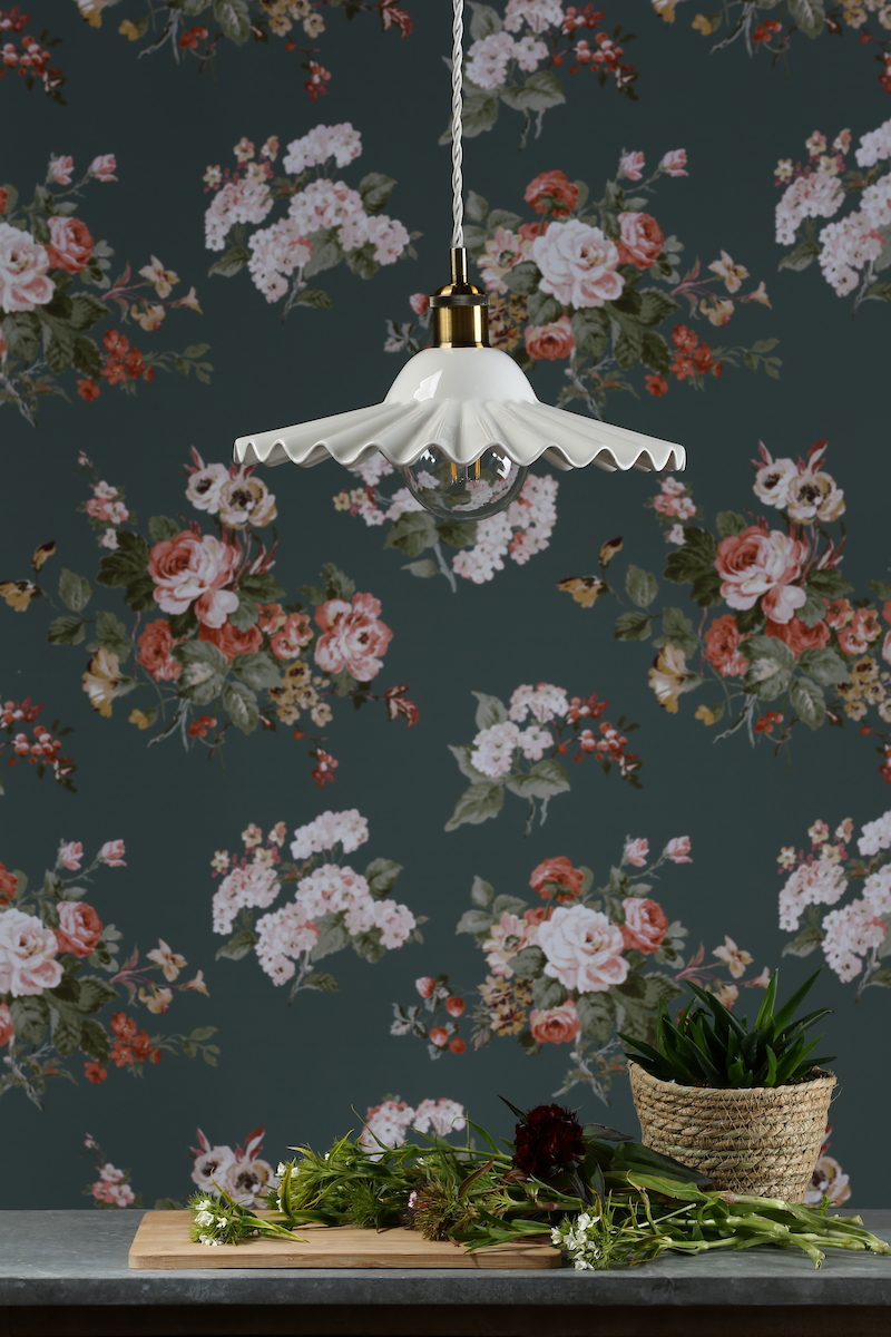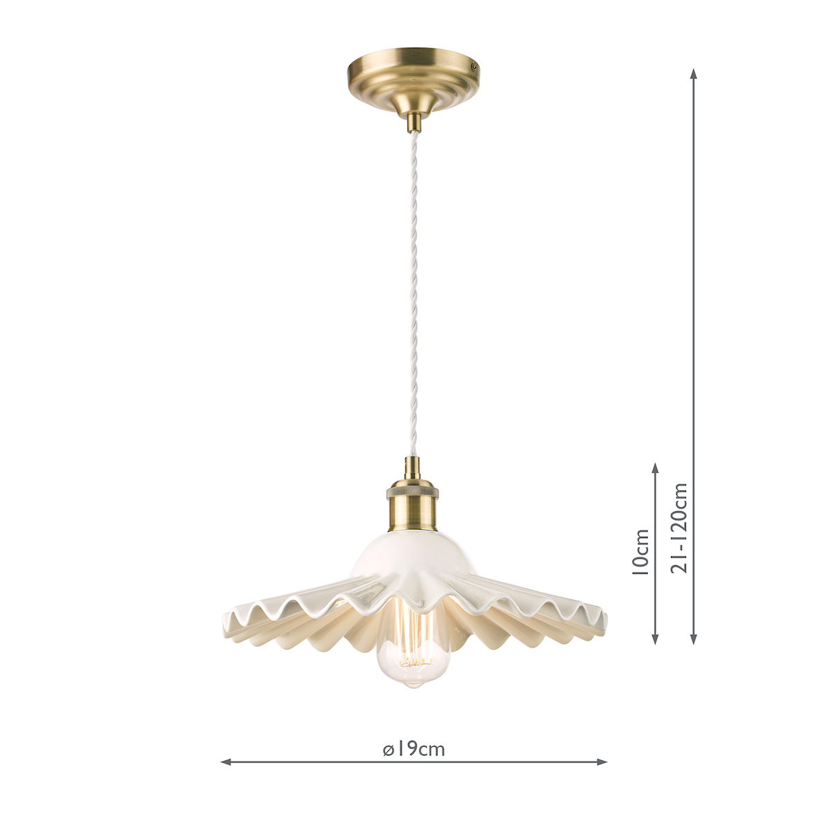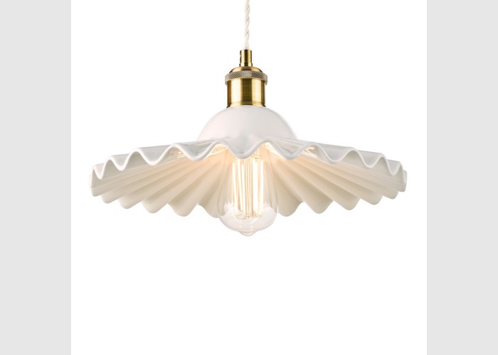 With pretty ruffled edges like a pie crust or dancer’s skirt, the Laura Ashley Beca Pendant ceiling light is a delight. This charming pendant shade is made of thick ceramic with a white gloss glazed finish. Also reminiscent of the undulations on a clam shell, the Beca is teamed with fittings in antique brass and a matching flat round ceiling rose.
