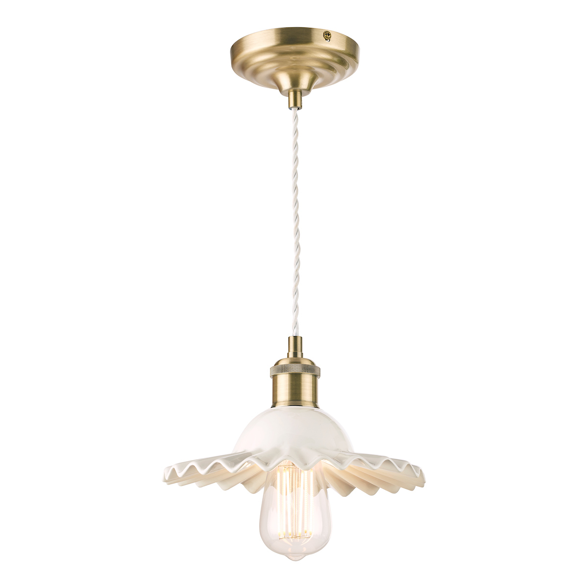With pretty ruffled edges like a pie crust or dancer’s skirt, the Laura Ashley Beca Pendant ceiling light is a delight. This charming pendant shade is made of thick ceramic with a white gloss glazed finish. Also reminiscent of the undulations on a clam shell, the Beca is teamed with fittings in antique brass and a matching flat round ceiling rose.