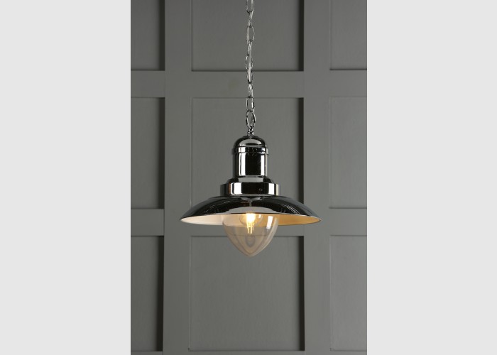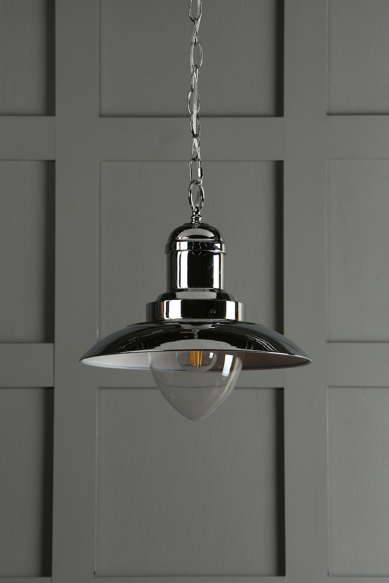 This traditional fisherman style Laura Ashley Corbridge Pendant metal ceiling light is just the thing to illuminate a dining table or positioned as a trio above a breakfast bar. With a bright, polished chrome finish, this hat-shaped light fitting will bring a smile to your eyes, without causing glare from the side, so you can hang it lower than other lights with more translucent shades.