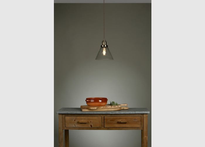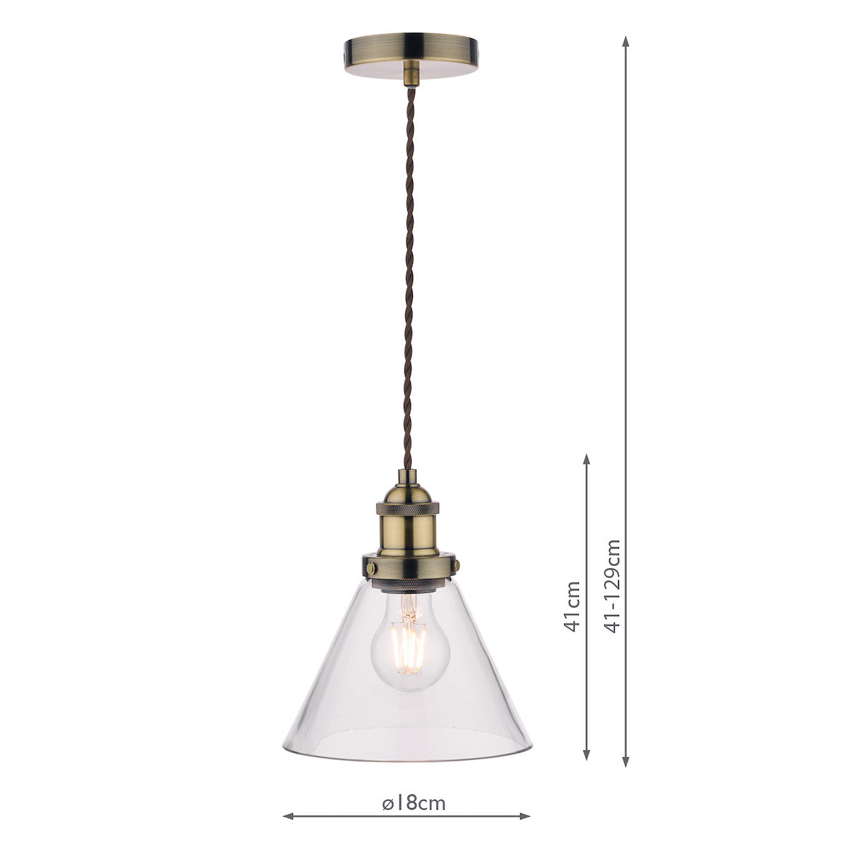 This contemporary hanging ceiling light boasts industrial appeal with a warm antique brass finish and cone-shaped clear glass shade.