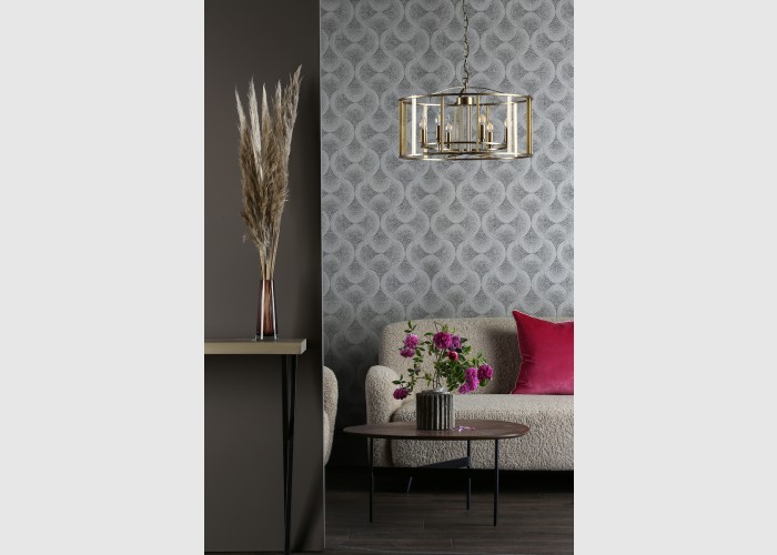 The MYKA 6 Light Pendant is an elegant brushed bronze fitting, encased in a decorative cage with a curved top.