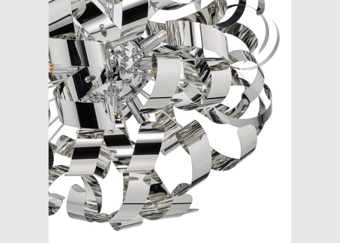 The Rawley 9 Light Pendant features twirling ribbons of polished chrome around a polished chrome frame.