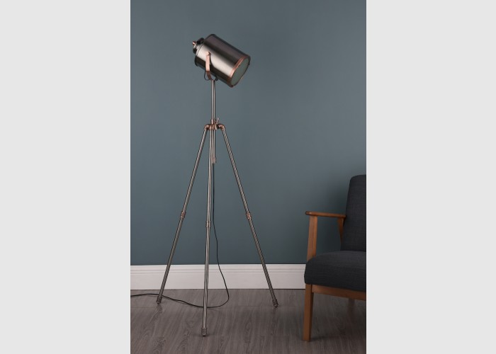 The Jake Floor Lamp is finished in antique silver and copper with a tripod style base featuring authentic pipe detailing giving this floor lamp a vintage industrial feel. The head evokes the mid-century studio lights and is adjustable to offer task lighting.