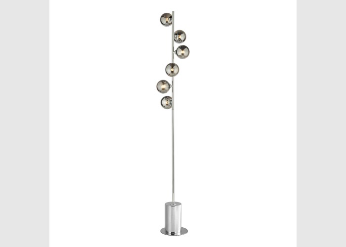 The Spiral 6 Light Floor Lamp features smoked glass globes spiralling around a vertical polished chrome bar with a dense, slender base and low profile plinth for a contemporary look.