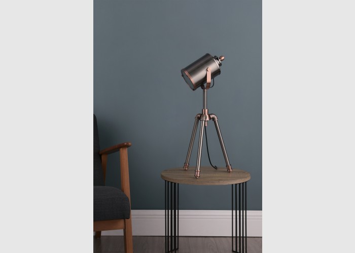 The Jake Table Lamp is finished in antique silver and copper with a tripod style base featuring authentic pipe detailing giving this table lamp a vintage industrial feel. The head evokes the mid-century studio lights and is adjustable.