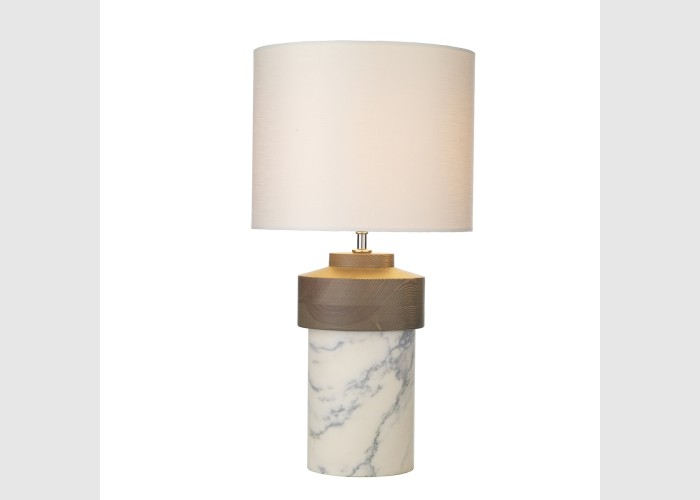 The David Hunt Nomad Table Lamp features a Pele de Tigre marble base with wood detailing that combines modern design with timeless elegance.