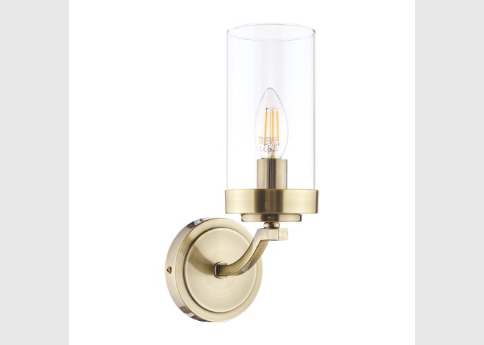The Laura Ashley Joseph Single Wall Light is an out of the ordinary wall fitting featuring a lamp holder, finished in warm antique brass, that supports a clear glass cylinder shade.